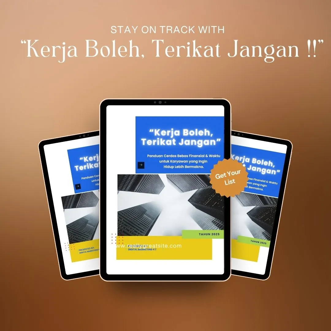 E-Book “Kerja Boleh, Terikat Jangan!” Dibuat untuk tujuan edukasi dan pengembangan mindset, bukan sebagai nasehat finansial, investasi, hukum atau pajak. Segala keputusan yang Anda ambil setelah membaca e-Book ini sepenuhnya merupakan tanggung jawab Anda. Hasil yang diperoleh dapat berbeda untuk setiap orang.
